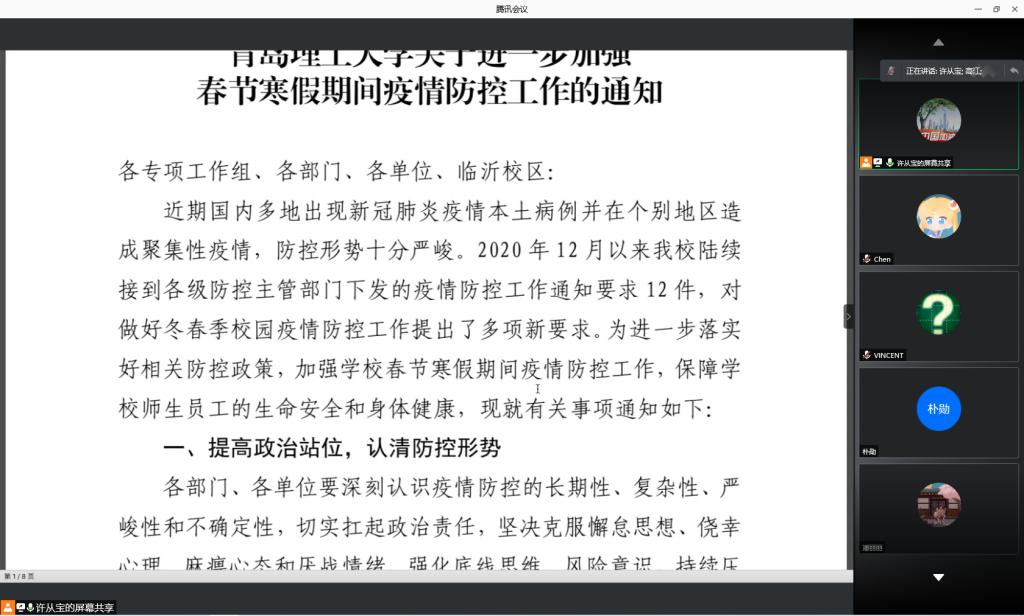 许从宝首先传达了《365完美体育关于进一步加强春节寒假期间疫情防控工作的通知》,就做好春节寒假期间疫情防控工作做出安排部署。许从宝强调,近期我国个别地区又出现了新冠肺炎散发病例和聚集性病例,疫情防控工作更不能松懈,务必要提高政治站位,认清防控形势,严格落实好相关防控政策,确保各项政策落地落实,做好春季学期开学相关准备工作,全体教职工务必要严格遵守学校要求,认真履责,配合学校工作。