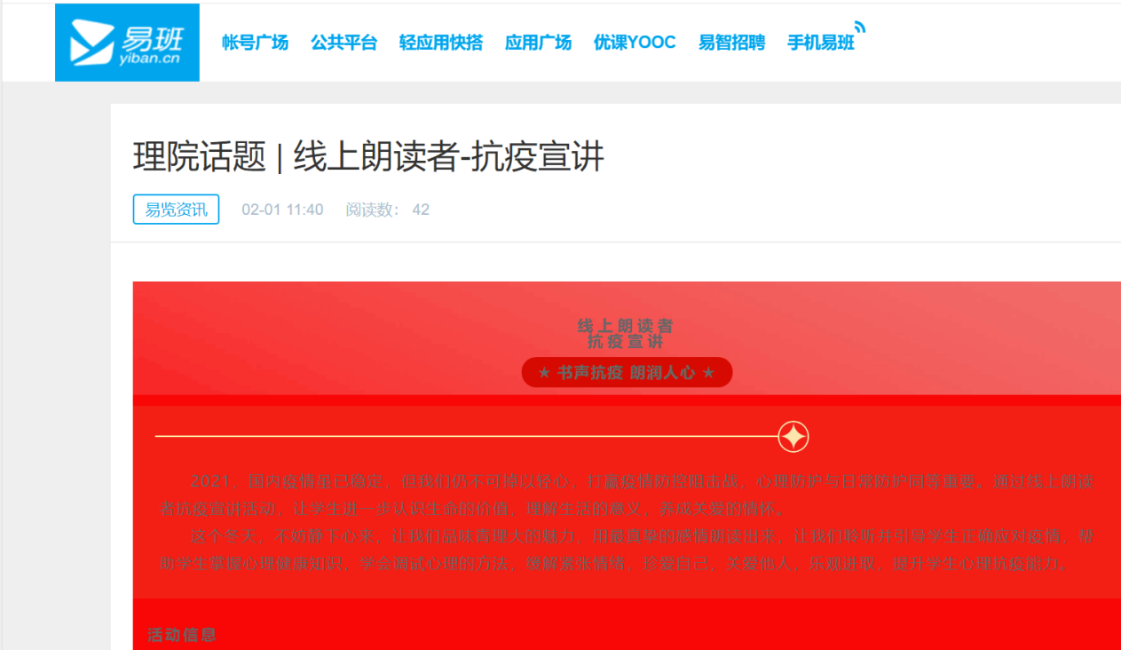 在国内疫情趋于稳定但抗疫形势仍然严峻的当下,为了响应学校号召,做好大学生寒假期间身心健康教育工作,同时丰富同学们的精神生活,理学院易班工作分站特举办线上朗读者——抗疫宣讲活动,并于2月22日圆满完成。