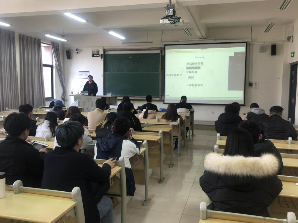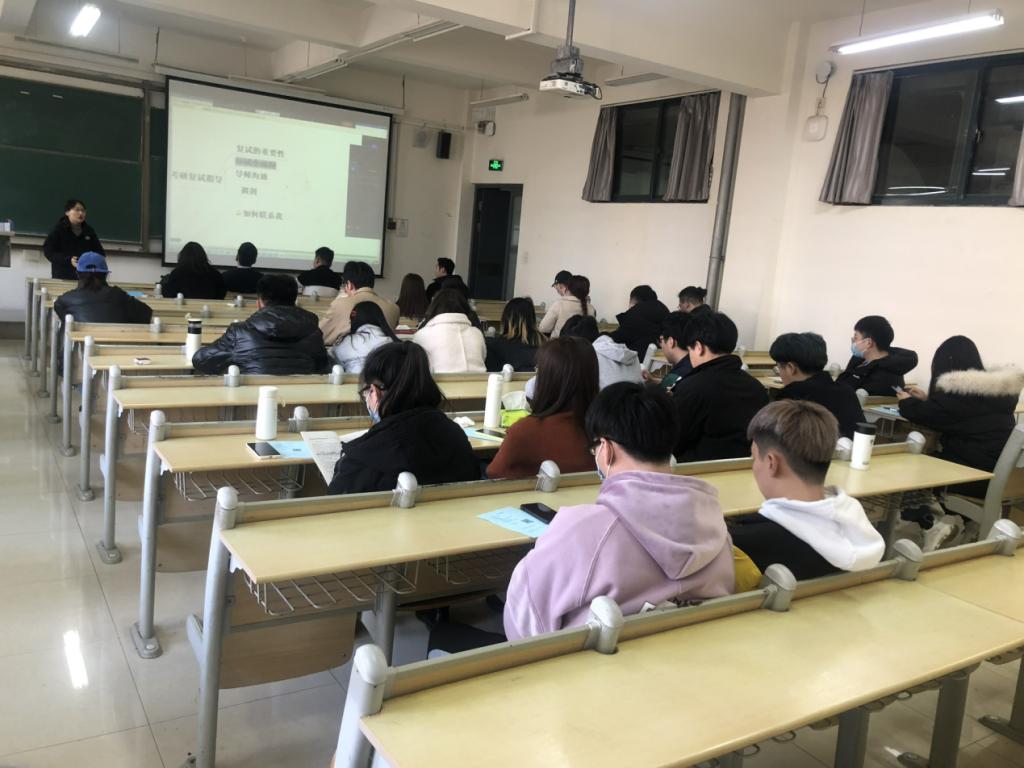 随后,胡强对从复试的重要性、复试的全流程和调剂三个方面进行公益性讲解,为同学们解答复试的内容及各部分权重、复试的材料准备、复试面试类型及技巧、调剂科目院校分数等相关内容,在座同学认真听、仔细记,并将存在的问题主动发言提出,胡强逐一耐心解答,现场互动良好,气氛热烈。
