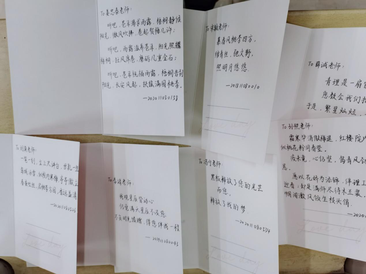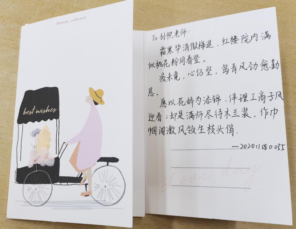 这是经贸191班周晋写给自己班主任和辅导员的三行情书。鉴于学院内女性老师众多,临近妇女节时,商学院扬帆社举办了“三行情书赠老师欢喜”特别活动,鼓励同学们向身边的老师尤其是女性老师们传达自己的爱与感激之情。活动一经推出便受到了同学们的强烈好评,累计收到了644份饱含着创意、爱意、新意的三行情书,涵盖了学院内外的74名老师。这其中有的是向自家的班主任和辅导员老师强力“表白”的,有的则是对耕耘在三尺讲台上的教师的“安利”,还有一部分则是对学生会、社团指导老师“打call”。扬帆社的社员们选取了一些同学们写给老师们的三行情书,将其写在卡片上,在妇女节当日献给老师们。拿到卡片后,老师们纷纷被同学们的“纸短情长”所打动,在这个特殊的日子里,感受到了身为教师和女性双重身份的感动与快乐。20级辅导员孙照在看到同学们的三行情书后表示“收到学生的情书,既有欣慰,又有惊喜,惊喜于这感人真挚的节日礼物,欣慰于教育工作得到了学生的认可。我将继续努力,无愧于学生的这份喜爱。”