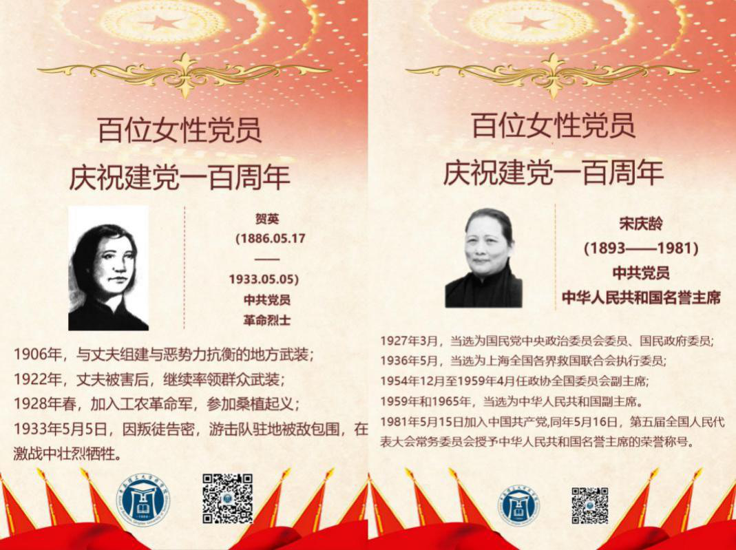 2021年恰逢中国共产党建党一百周年,在这个特殊的年份,商学院组织专人精心挑选、整理了100位优秀的女性共产党员的先进模范事迹,以海报的形式在学院的官方微信公众号“商说商道”上进行每日推送。这100位女性党员模范涵盖了各行各业的女性精英,有为了国家、民族、革命抛头颅、洒热血的革命先烈,也有打赢疫情防控战、脱贫攻坚战的当代模范,百年来,巾帼英雄们以对党的忠诚,用自己的生命和热血为新中国的成立与发展贡献巨大力量。她们自强不息、艰苦奋斗、开拓创新,焕发智慧与柔韧的光芒,她们走上不同的社会舞台,尽显风采,以卓越的成就赢得世人的喝彩与注目,展现出自尊自信自立自强的精神风貌。她们是整个国家与民族的骄傲,用自己的顽强、汗水和拼搏顶起来各自领域的“半边天”。