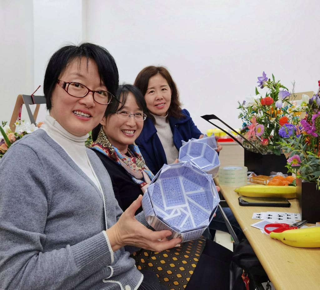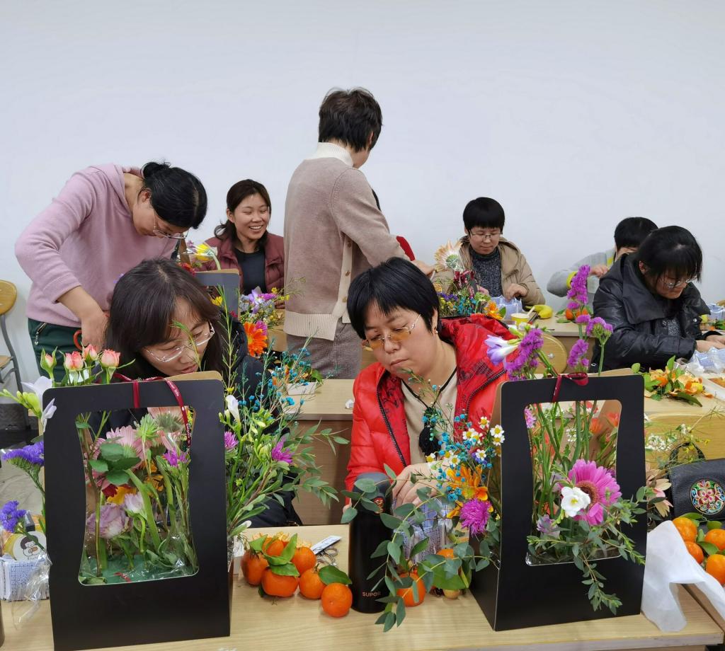 随后,有着“花艺师小蕾”之称的的张蕾老师为老师们示范传授插花技艺,老师们挑选喜爱的鲜花,插出心中最美的花篮,一时间花在人中相映红,人在花中别样美。随后,邹传波为2021年度“三八红旗手”“女工先进个人”和“最美家庭”获得者颁发了奖金和证书,鼓励大家在2021年再创辉煌,同时,邹传波还教授大家用扑克牌做手工,老师们拿着自己的作品拍照调侃,现场气氛热烈。