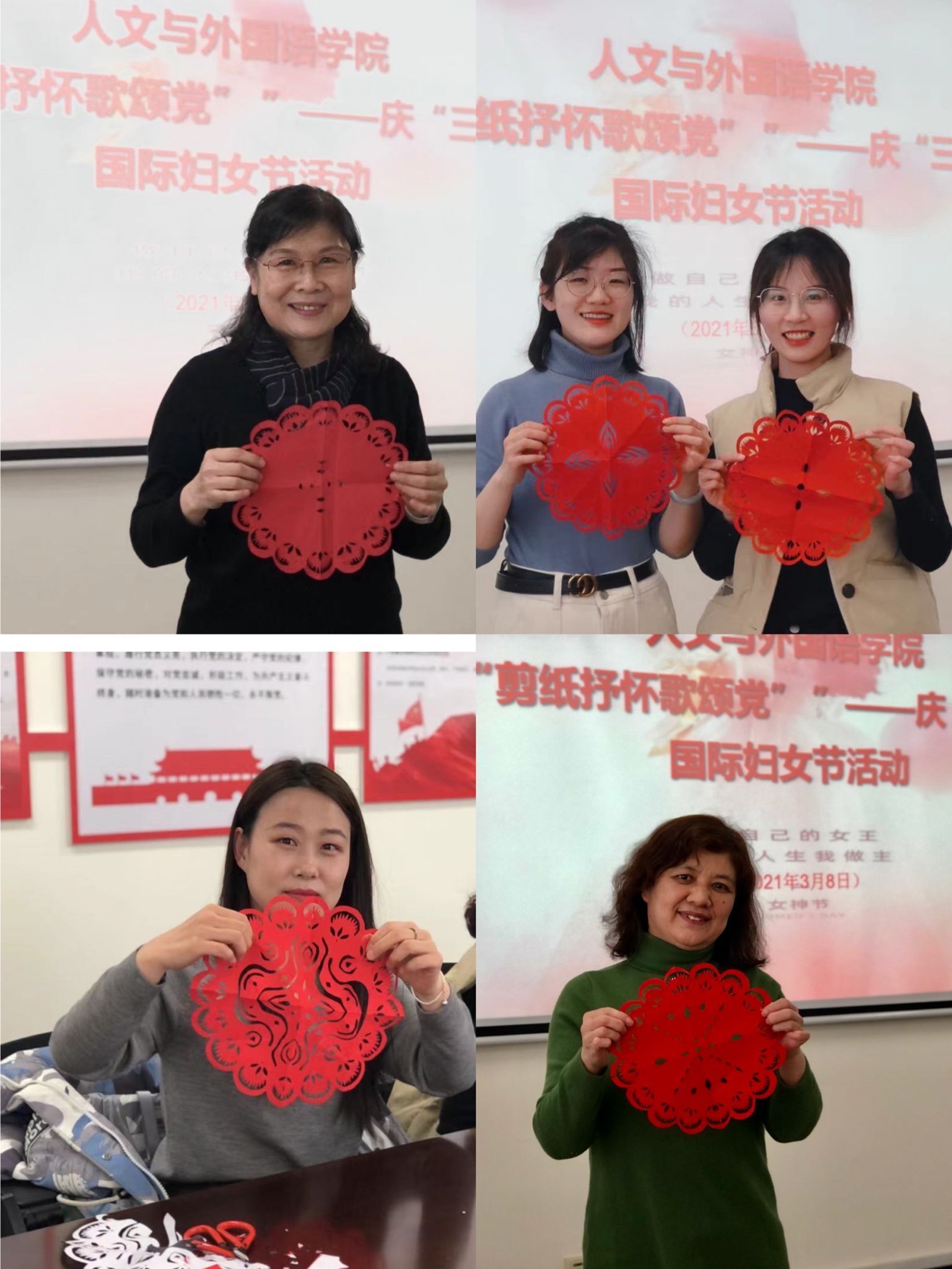 为纪念第111个“三八”国际劳动妇女节,丰富学院女性师生的精神文化生活,献礼建党100周年,3月8日下午,人文与外国语学院在A410教室开展“剪纸抒怀歌颂党”——庆“三八”国际劳动妇女节活动。活动邀请非物质文化遗产传承人薛玉红担任指导老师,学院女性师生积极响应踊跃参加。