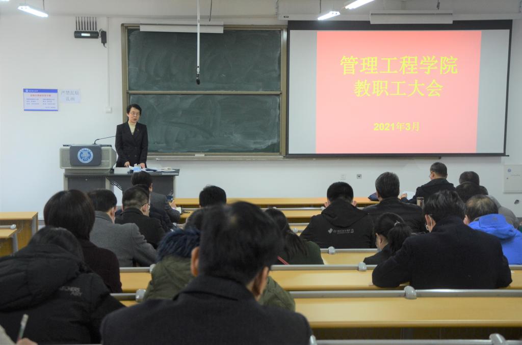 3月10日下午,管理工程学院2021年春季新学期全院教职工大会在嘉陵江路校区中央院系区C1-1楼202教室召开。学院班子成员和全体教职工参加会议。会议由党总支书记梁虹主持。