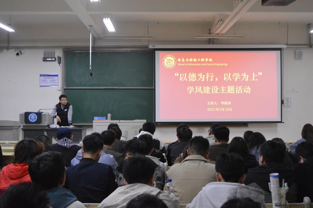 为进一步深化立德树人的教育理念,营造积极向上的育人环境,给学生提供一个学习交流分享的平台,信息与控制工程学院于3月18日在主教楼B218举办“以德为行,以学为上” 学风建设主题活动,会议由辅导员季献涛主持,19级计算机、自动化专业全体同学参加。