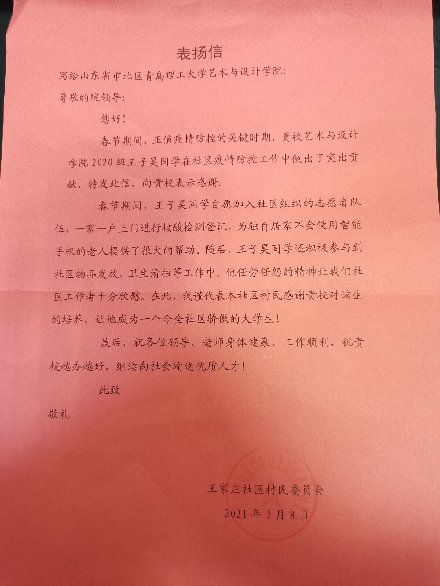 3月23日,艺术与设计学院收到一封表扬信,该信来自日照市岚山区王家庄社区村民委员会,信中对艺术与设计学院2020级艺设205班王子昊同学在寒假社区疫情防控工作中的突出表现进行了表扬。