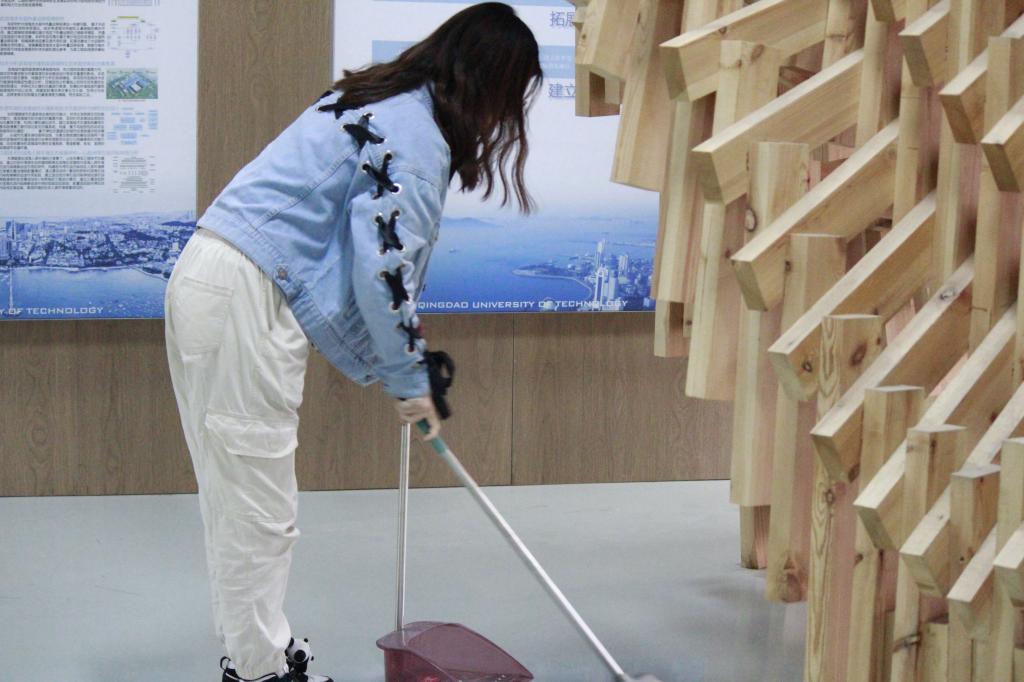 小小“主人翁”,担当大作为。建筑馆与滨海人居环境学术创新中心作为广大建院学子学习生活的地方,为大家学习和生活提供了舒适的环境,为此,建筑与城乡规划学院积极教育与鼓励20级同学们化身为小小“主人翁”,拿起卫生工具,主动清扫自己学习和生活的地方。活动开始后,在辅导员郑润琪与各班主要班委的带领下,同学们纷纷领取卫生工具前往各班负责区域进行清扫。过程中,同学们积极主动,认真清扫地面杂物,不放过任何死角;卖力拖洗地面,使地面重获新貌;埋头擦拭展台,让其中的建筑模型展示其应有风采……活动热火朝天地进行着,建筑馆的面貌也在不知不觉中焕然一新。