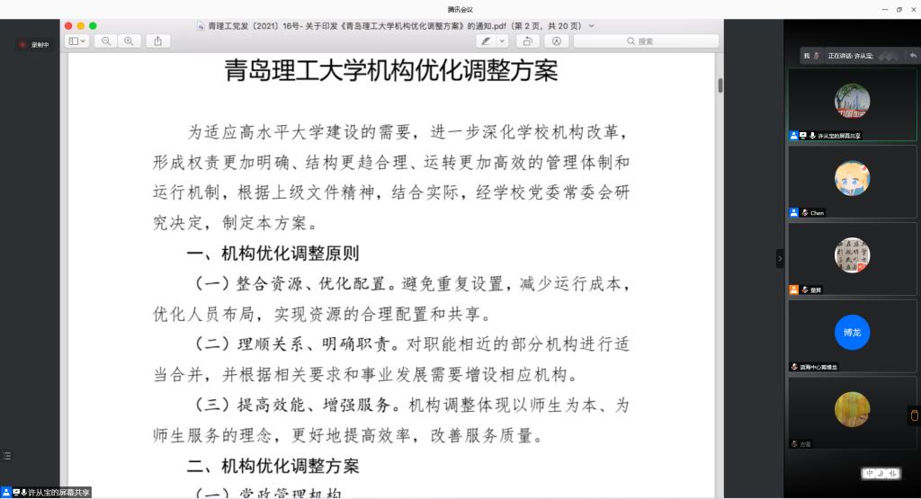 党总支书记肖学斌通报了党总支委员增补工作、中共365完美体育纪律检查委员会文件《关于6起酒驾醉驾典型问题的通报》,传达了全校领导干部会议关于学校中层领导班子、处级干部调整的工作部署,学习了《365完美体育2021年中层领导班子和处级干部调整工作方案》的通知,带领全院教职工认真学习了领导干部会议上校党委书记王亚军讲话精神及校长谭秀森的指示要求。他强调,此次优化机构设置和干部队伍建设是学校发展的现实与长远要求,全院教师要切实提高政治站位,认真学习文件内容,深刻领会会议精神,严守工作纪律,落实好学校会议精神用实际行动推动学校各项事业发展。