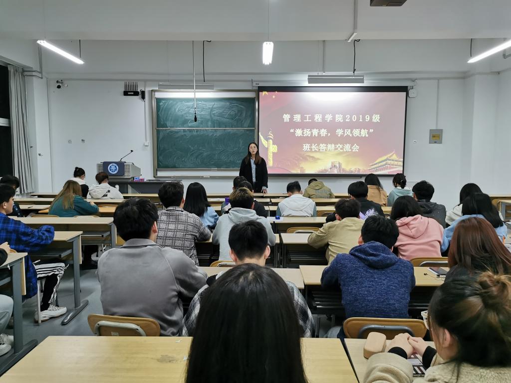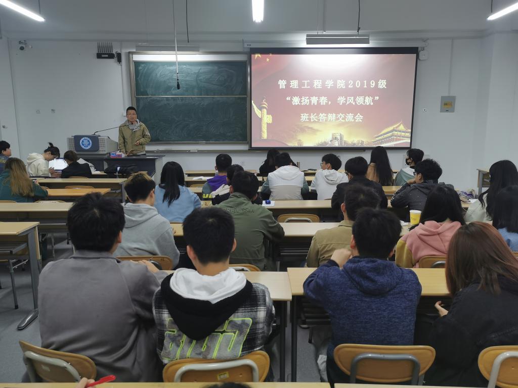 为积极响应学校学风建设号召,提高管理工程学院2019级学生骨干责任意识,增强其工作积极性,4月21日晚,管理工程学院19级在第二教学楼203教室举办“激扬青春,学风领航”班长述职答辩会议,19级辅导员李佳妮、张冯冯,2019级班长、团支书、副班长参加了此次活动。会议由张冯冯主持。