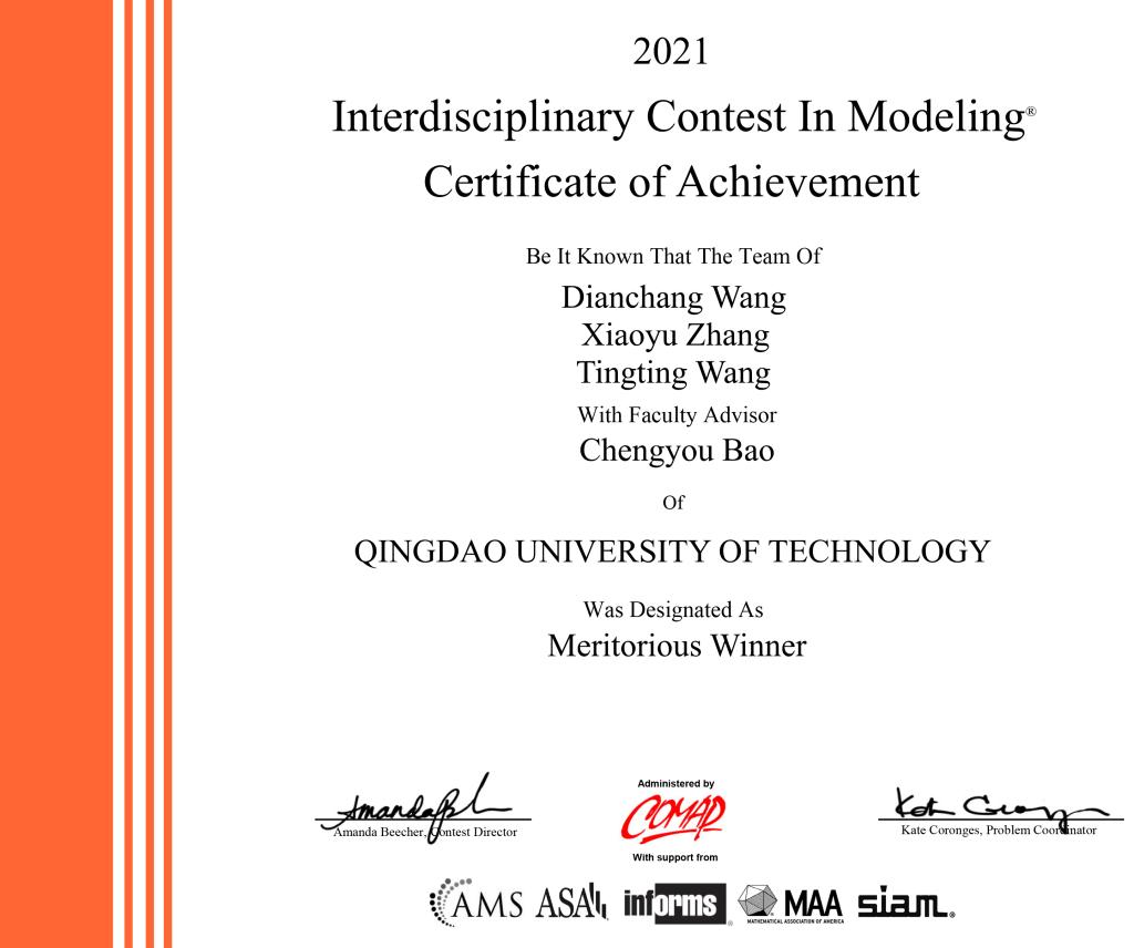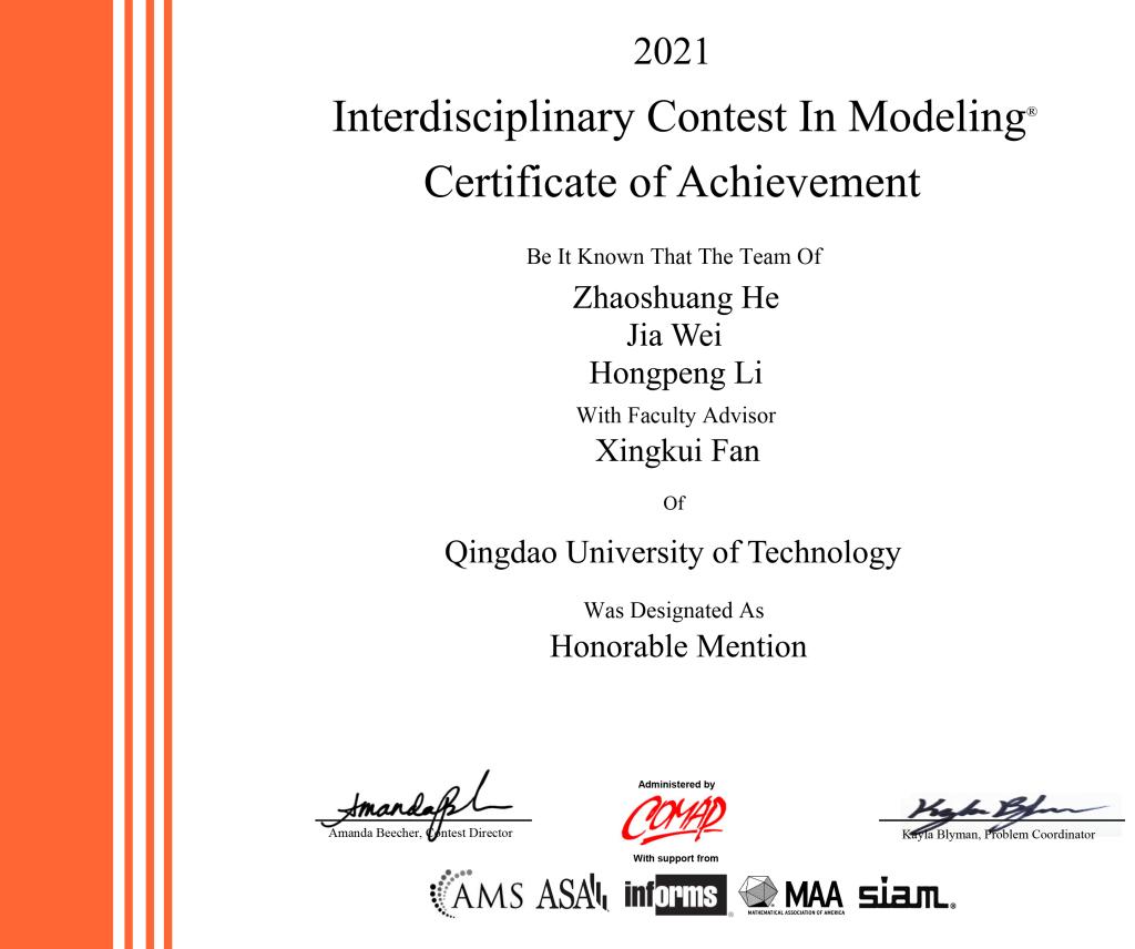 4月24日,2021年美国国际大学生数学建模竞赛(MCM/ICM)成绩揭晓,365完美学子收获颇丰,在理学院数学建模指导组的指导下,有48支参赛队喜获佳绩:其中获得美赛一等奖(Meritorious Winner)1项、美赛二等奖 (Honorable Mention)14项、美赛三等奖(Successfully Participation)33项!