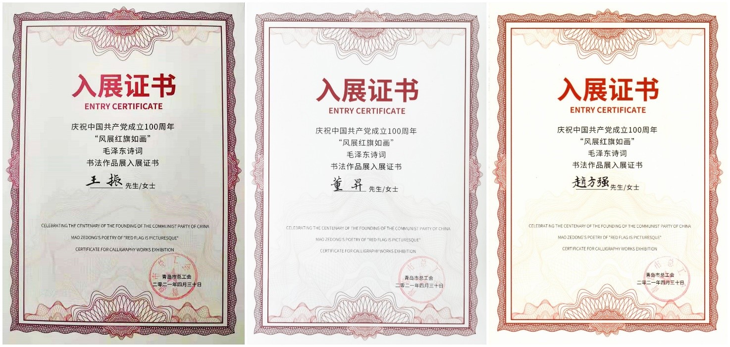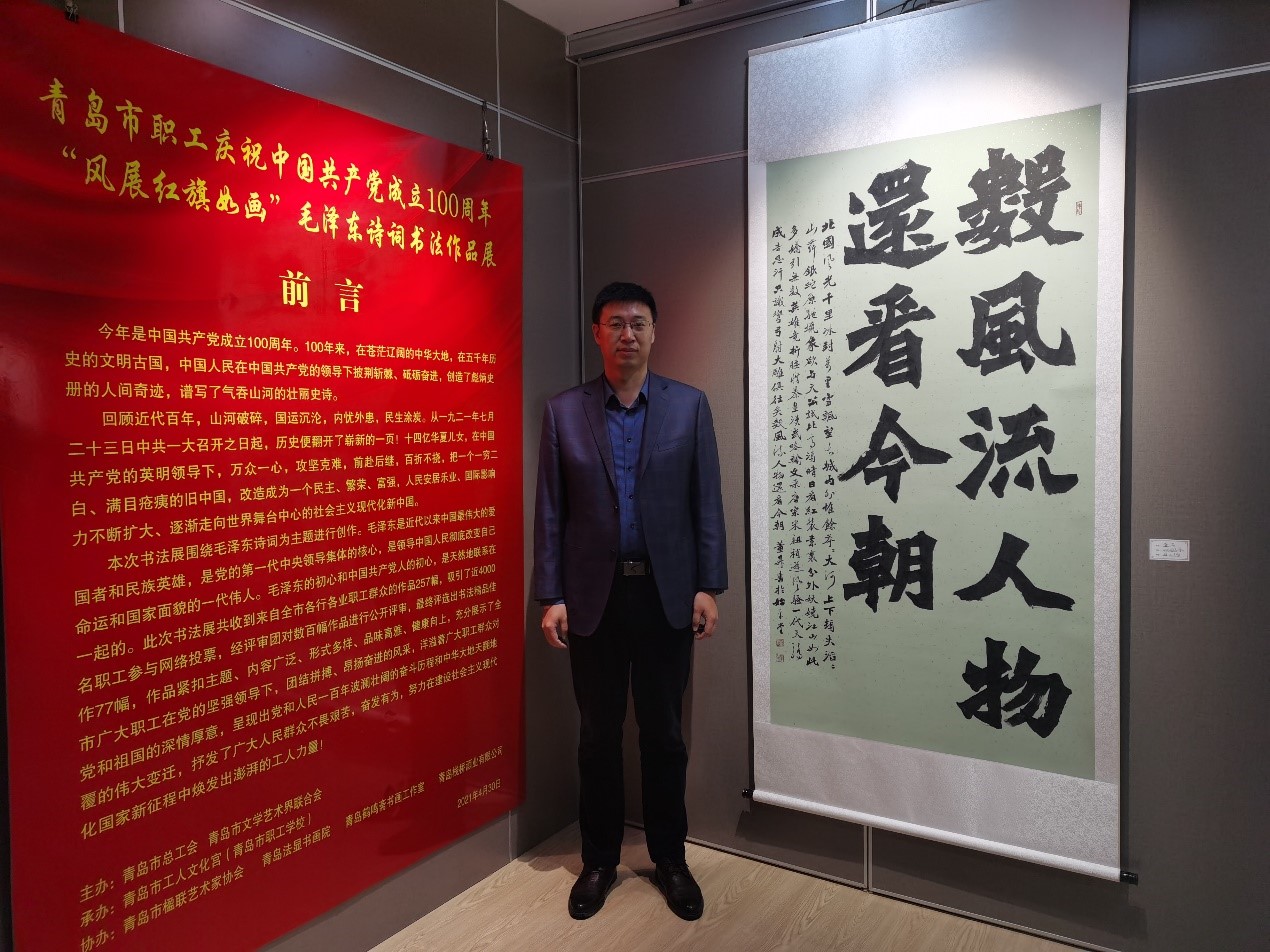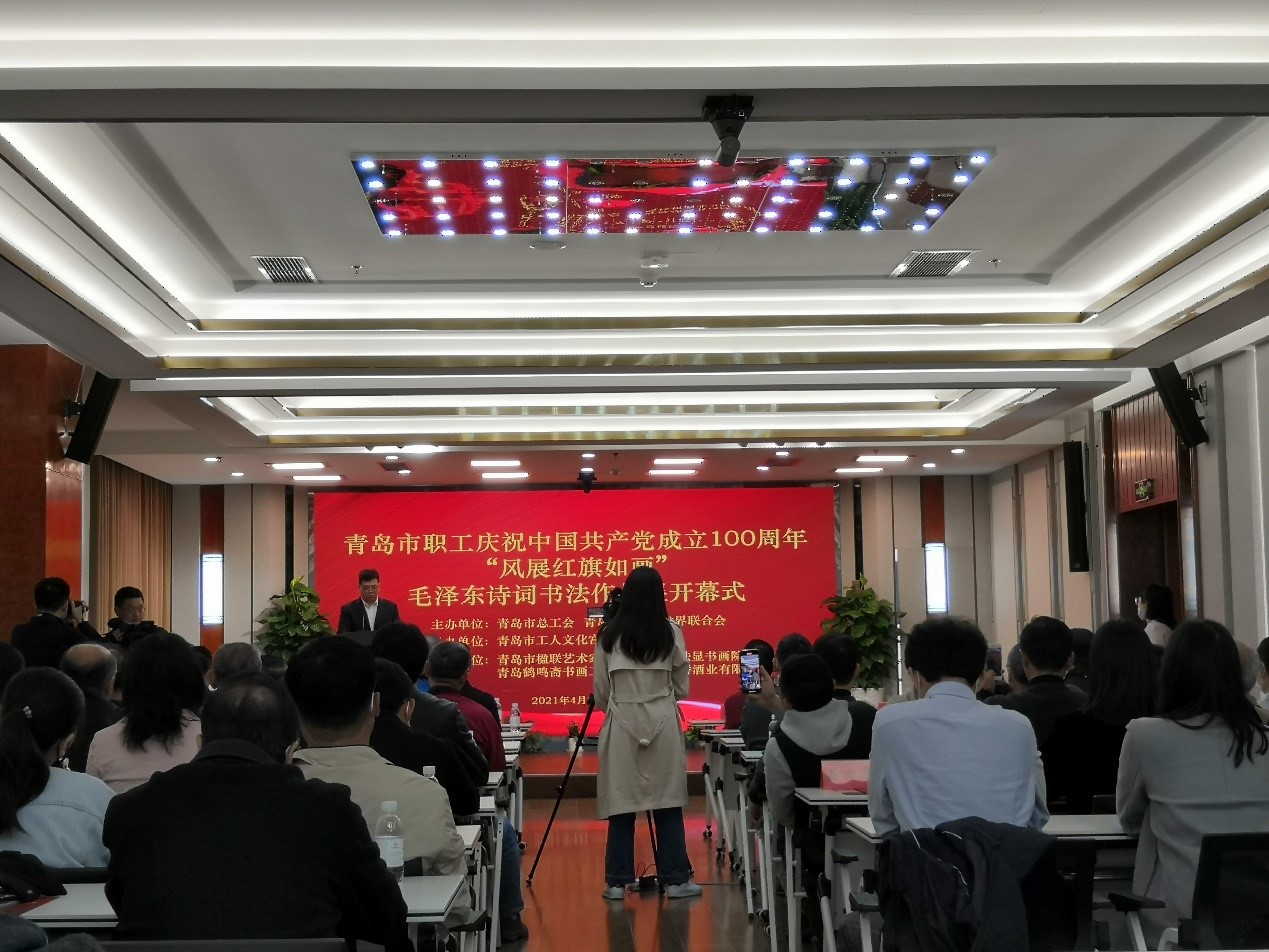 4月30日,由青岛市总工会、青岛市文学艺术界联合会主办的青岛市职工庆祝中国共产党成立100周年“风展红旗如画”毛泽东诗词书法作品展在青岛市工人文化宫开幕。