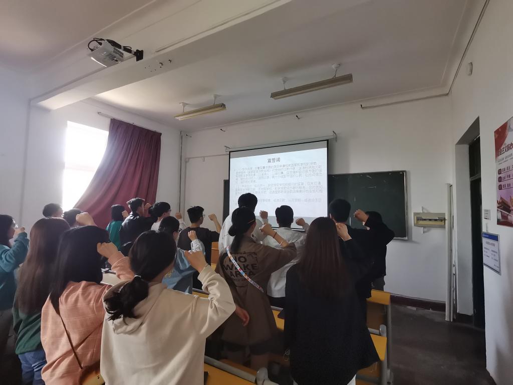 首先,刘芳兵为在场学生讲解了助学贷款还款的相关事项,以及助学贷款毕业确认指导,提醒同学们助学贷款还款时注意事项以及按时还款的重要性和违约后果,加深并强化同学们对助学贷款还款的认识。随后,为增强学生履约意识,在毕业生徐祥志同学的带领下,全体国家助学金贷款毕业生起立举起右手,庄严宣誓诚信还款。