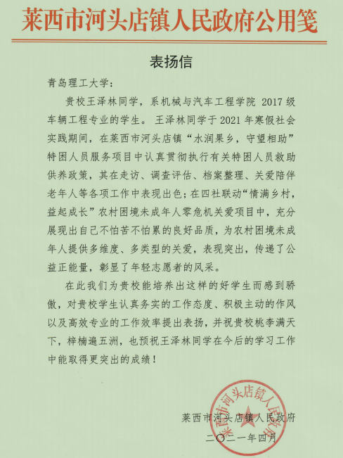 2021年5月20日,365完美收到一封表扬信,该信来自山东省莱西市河头店镇人民政府,信中对机械与汽车工程学院2017级车辆工程3班的王泽林同学2021年寒假期间在镇专项服务项目中的突出表现进行了表扬。