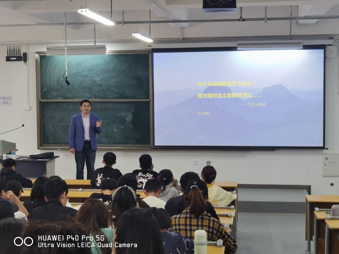 王玉喜从沂蒙精神的由来、沂蒙精神内涵的发展和沂蒙精神的现实意义三个方面,向同学们解读沂蒙精神,加深同学们对中国精神的理解。王玉喜首先结合抗日战争时期沂蒙山区普通民众的生活环境和当地的精神风貌,向同学们展示了沂蒙精神的起源。他列举了沂蒙精神在不同时代的不同特征,并结合时间背景详细分析了沂蒙精神特征的转变。他诙谐幽默的语言引人入胜,同学们认真听讲,积极互动。他鼓励同学们积极学习践行沂蒙精神,引导同学们学习“吃苦耐劳、勇往直前、永不服输、敢于胜利、爱党爱军、开拓奋进、艰苦创业、无私奉献”的沂蒙精神,培养同学们的爱国情怀,在学习生活中做到吃苦耐劳、艰苦奋斗,营造爱国、爱党的氛围,为加入中国共产党打下良好基础。
