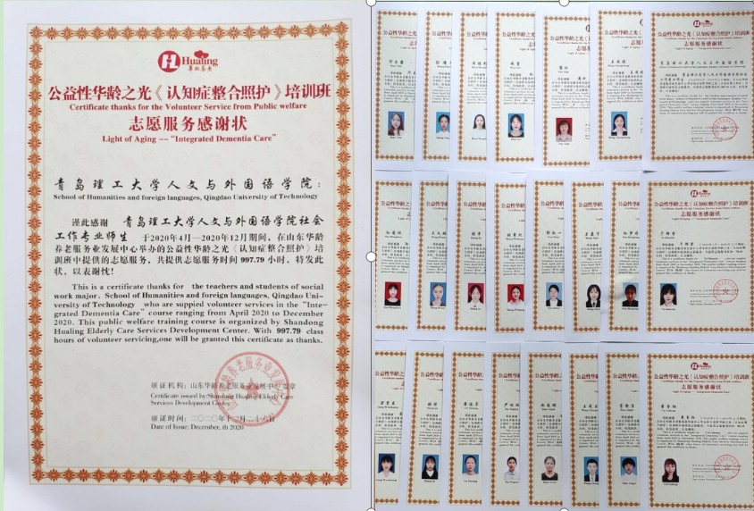 认知症是一种记忆力、思维、行为和日常活动能力退化的综合征,是全世界老年人残疾和照护依赖的主要原因之一。为应对由于认知症知识缺乏而导致的照护难题,培育青岛地区的认知症“种子讲师”“华龄之光”团队邀请台湾认知症整合照护专家伊佳奇作为主讲老师,在疫情期间面向青岛市老年服务从业者开展了《认知症整合照护》线上培训课程。课程从2020年4月到2020年12月,共持续9个月,合计33课时。王成程带领社工专业学生为课程提供了共计997.79小时的志愿服务,具体包括课程宣讲、组织讨论、录制视频、文字记录,以及课程公众号运营等工作;潘玲为课程提供了“如何通过口才让宣讲内容锋竞彩”的主体培训。最终形成约3000小时的课程视频和54多万字的课程记录。