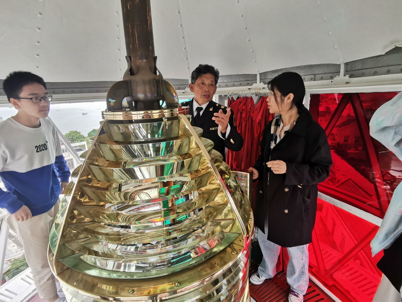 王炳交对同学们的到来表示热烈欢迎,在狭小的灯塔塔顶,他满怀激情地向大家介绍了团岛灯塔的发展历史、工作原理和养护知识,并结合自己45年如一日守护灯塔的亲身经历,向大家展示了祖国灯塔的百年变迁和一名基层党员的职业坚守。值守灯塔期间,他先后进行了二十几项技术革新,大大延长了设备使用寿命,为国家节约了大量经费,团岛灯塔也因此被评为国家一级灯塔。