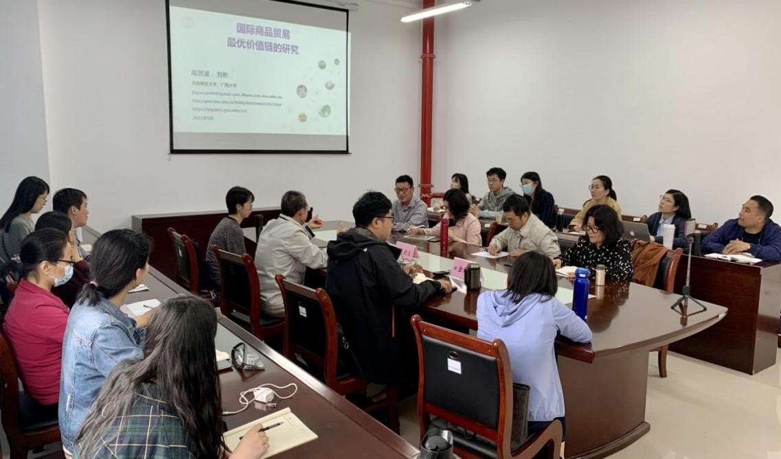 5月26日下午,第19期西海岸商学论坛在商学院411会议室举办。本期邀请北京师范大学高剑波教授担任主讲,主题为“国际商品贸易最优价值链的研究”。商学院相关专业教研室教师和研究生通过线上和线下等方式参加会议,院长助理金炜博主持会议。