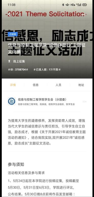为引导同学们发扬诚信精神,增强同学们的感恩意识,焕发青春正能量,信息与控制工程学院举办了“诚信伴我行”主题征文活动,截至6月3日,主题征文活动圆满结束。
