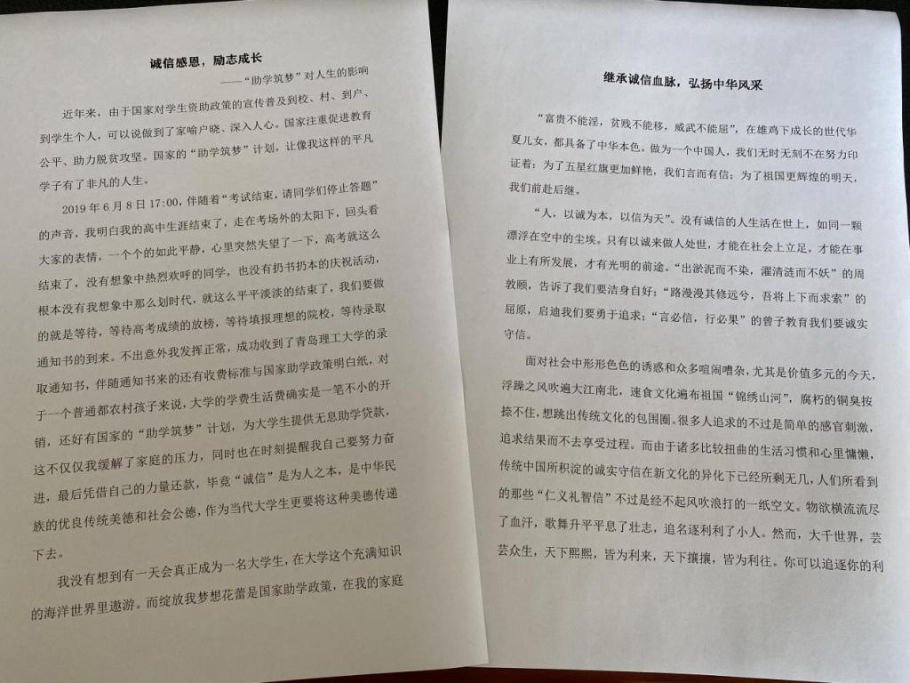 信息193班张展同学在征文里写道,国家的“助学筑梦”计划,让一个平凡的农村学子拥有了非凡的人生。他入校以来,一直享受国家助学金,一定程度上帮助家里减轻了经济负担。他说:“我一定要好好珍惜现有的学习机会,立志用行动来感谢我的祖国、我的父母、我的老师们,坚决不辜负他们对我的期望!”计算203班赵智超的文章题目是《继承诚信血脉,弘扬中华风采》,她用自己的笔记录了古往今来的诚信事件,以个人独特的视角阐述了对个人诚信的理解,同时也呼吁广大同学从自身做起,把自身的诚信建设放在第一位。