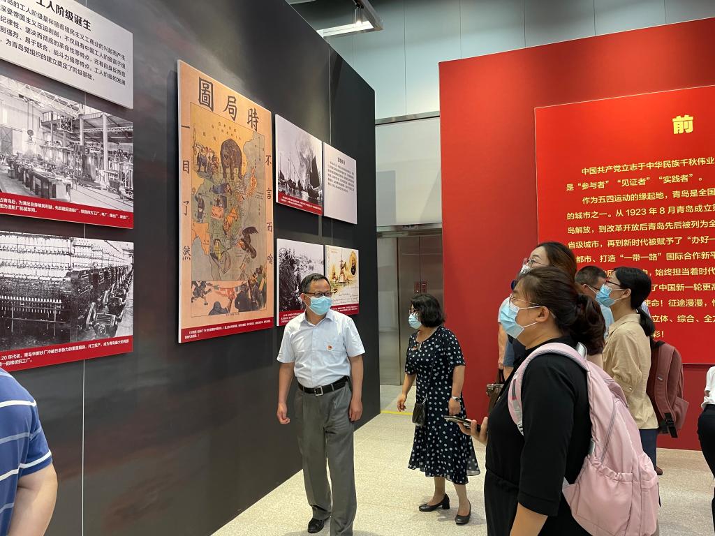 为进一步深入开展党史学习教育,7月9日上午,商学院党委组织教工支部和学生支部党员40余人参观庆祝中国共产党成立100周年青岛主题展,开展党史学习教育现场专题学习。