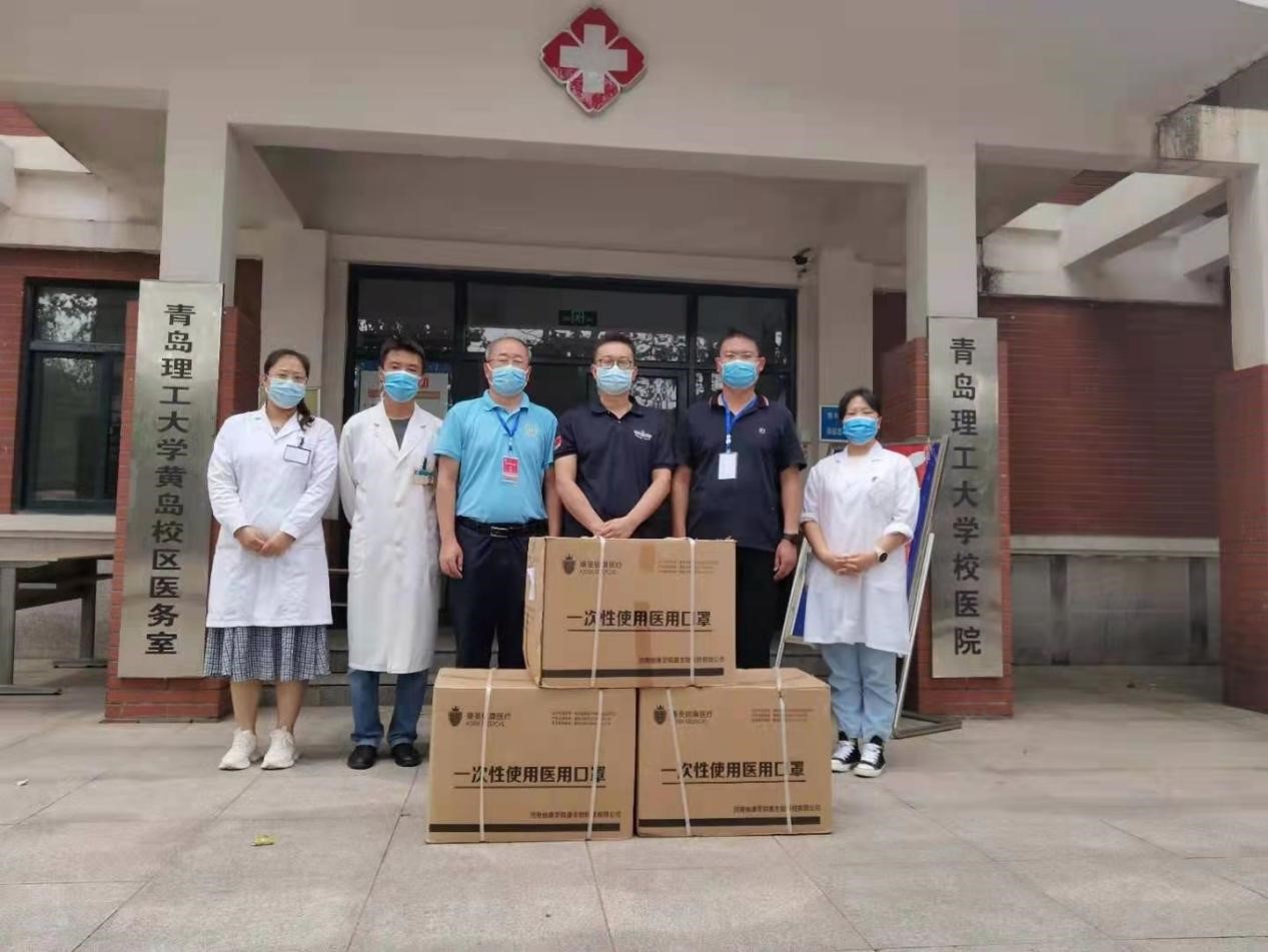 8月26日,正值秋季开学之际,青岛鑫闪闪文化传媒有限公司杨文波经理为学校捐赠一次性使用医用口罩9000只,后勤党总支书记乔海涛、学生处处长焦红良、校医院副院长崔晓健代表学校在嘉陵江路校区校医院楼前接受公司捐赠。