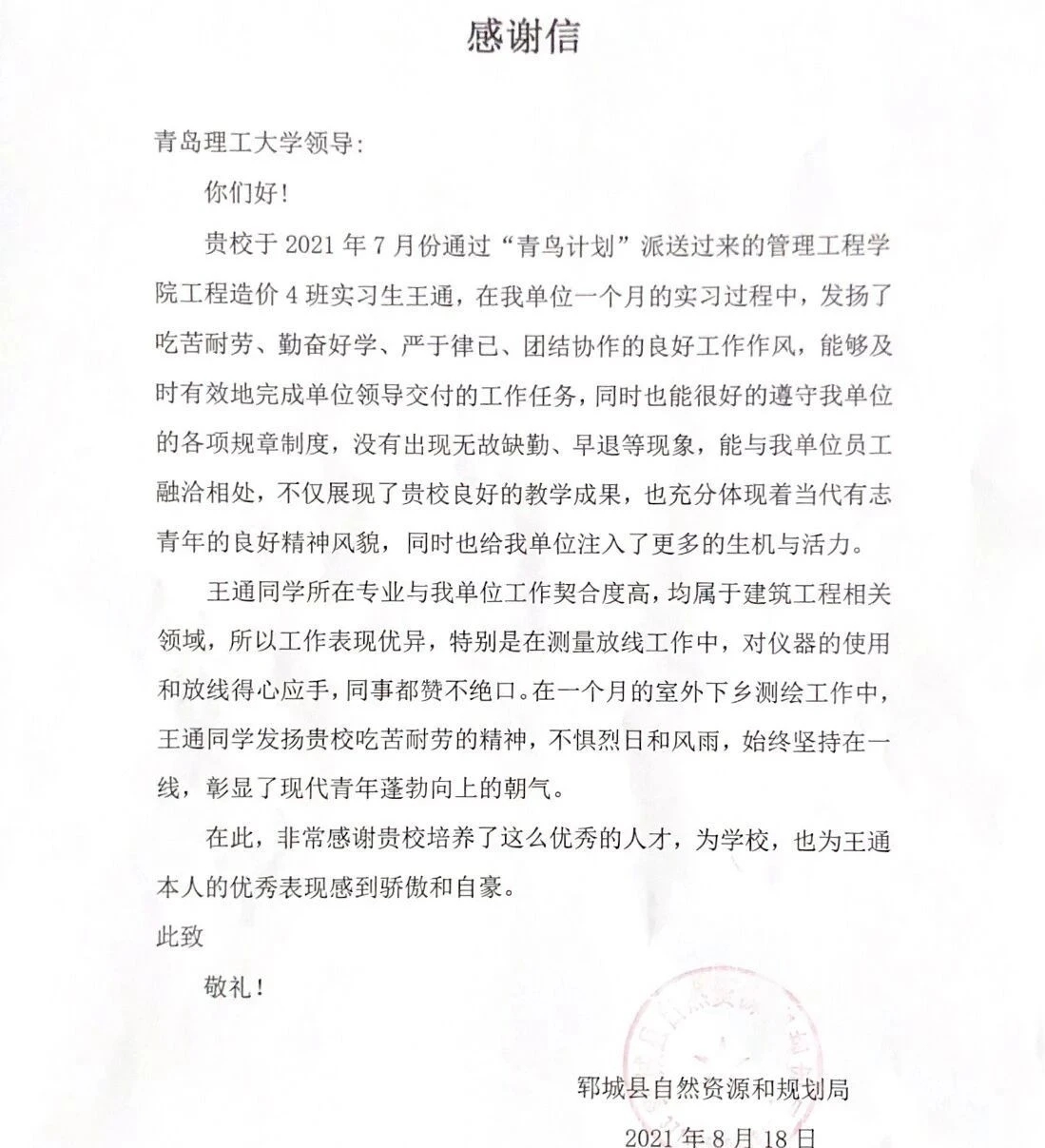 近日,一封来自山东省鄄城县自然资源和规划局的感谢信被送到管理工程学院老师的手中。信中对造价194班王通同学暑假期间在实习实践工作中的优良工作作风和优异表现给予了充分的肯定与赞扬, 并对学校培养出勇于担当奉献的学子表示感谢。