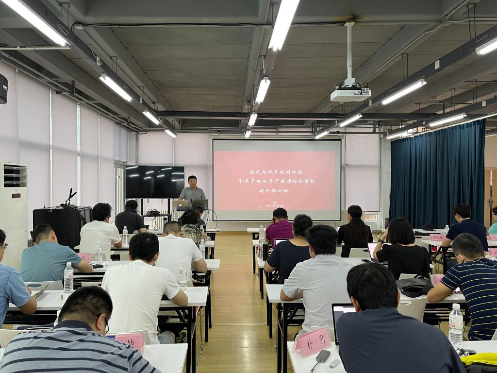 8月27日,建筑与城乡规划学院中层干部及骨干教师综合素能提升培训班开班仪式在滨海人居学术创新中心7楼会议室举行。学院党委书记肖学斌、学院院长许从宝出席并讲话,学院党政领导班子及各系(中心)党政班子成员、学院骨干教师参加培训,副院长解旭东主持会议。