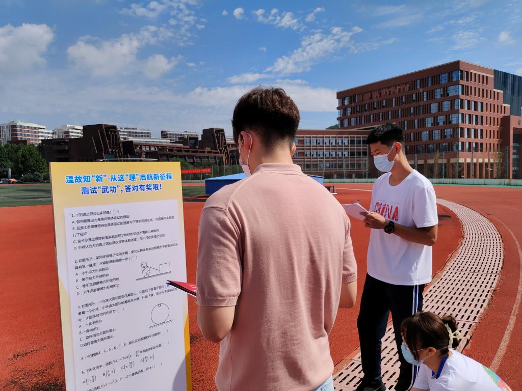 在迎新现场,“理学院热烈欢迎2021级小萌新”的巨型条幅映入眼帘,在学院简介、教师风采展示区域还设置了温故知“新”·“武功”测试环节,新生核验身份、领取一卡通和公寓钥匙后,班助和志愿者会引导感兴趣的小萌新参与答题,赢取小奖品。这是结合学院学科特色、新生专业特点的暖场小活动。看着题板上的物理和数学题目,有新生直呼:“经过一个长假放松,突然意识到要抓紧时间认真投入学习了!”这项特色迎新内容让新生入学伊始就感受所学专业的“轻压力”,让新生报到后迅速“收心”,以便尽快融入新环境、新集体,开启学业新征程。(撰稿:刘心芝;摄影:袁洪孝;审核:刘聘)