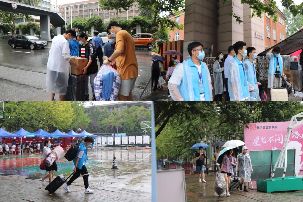 接过你的行囊,我们就是一家人。学院组建志愿者服务队,在车站接站点安排了接站老师、志愿者以及相关车辆,为新生返校保驾护航。志愿者们佩戴工作证,身穿志愿服,在雨中接过一件件行囊,为新生答疑解惑、帮助新生办理登记手续,一条龙的志愿服务为新生提供了满分便利。虽然阴雨绵绵为迎新工作带来了一定的不便,但在老师、班助和志愿者们的密切配合、齐心协力下,大家用饱满的工作热情为新生提供细致温暖的服务,用实际行动为学校“家文化”建设贡献力量,传达了对新生的切切真情。