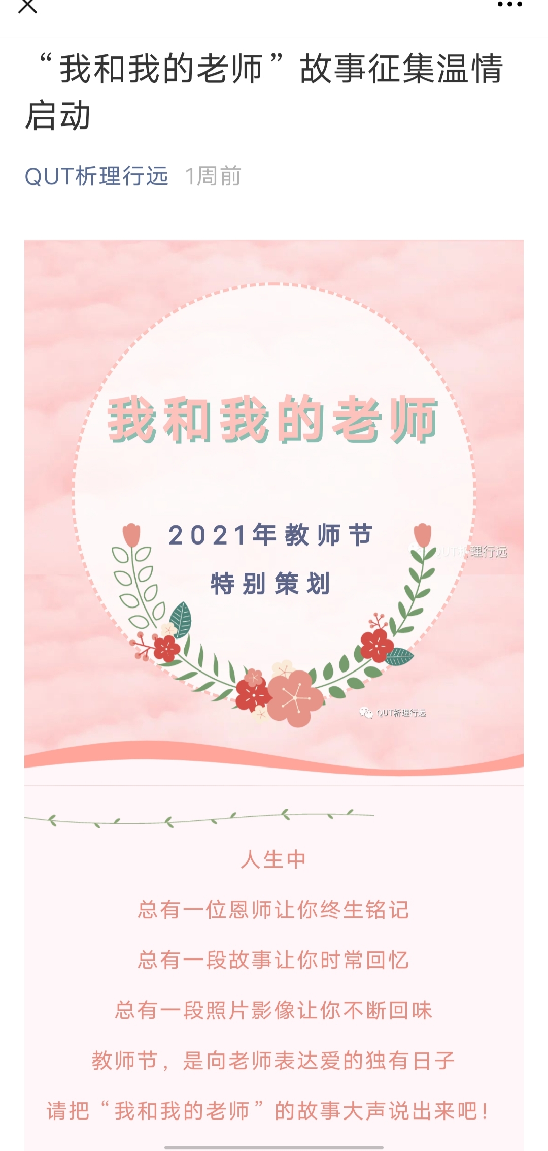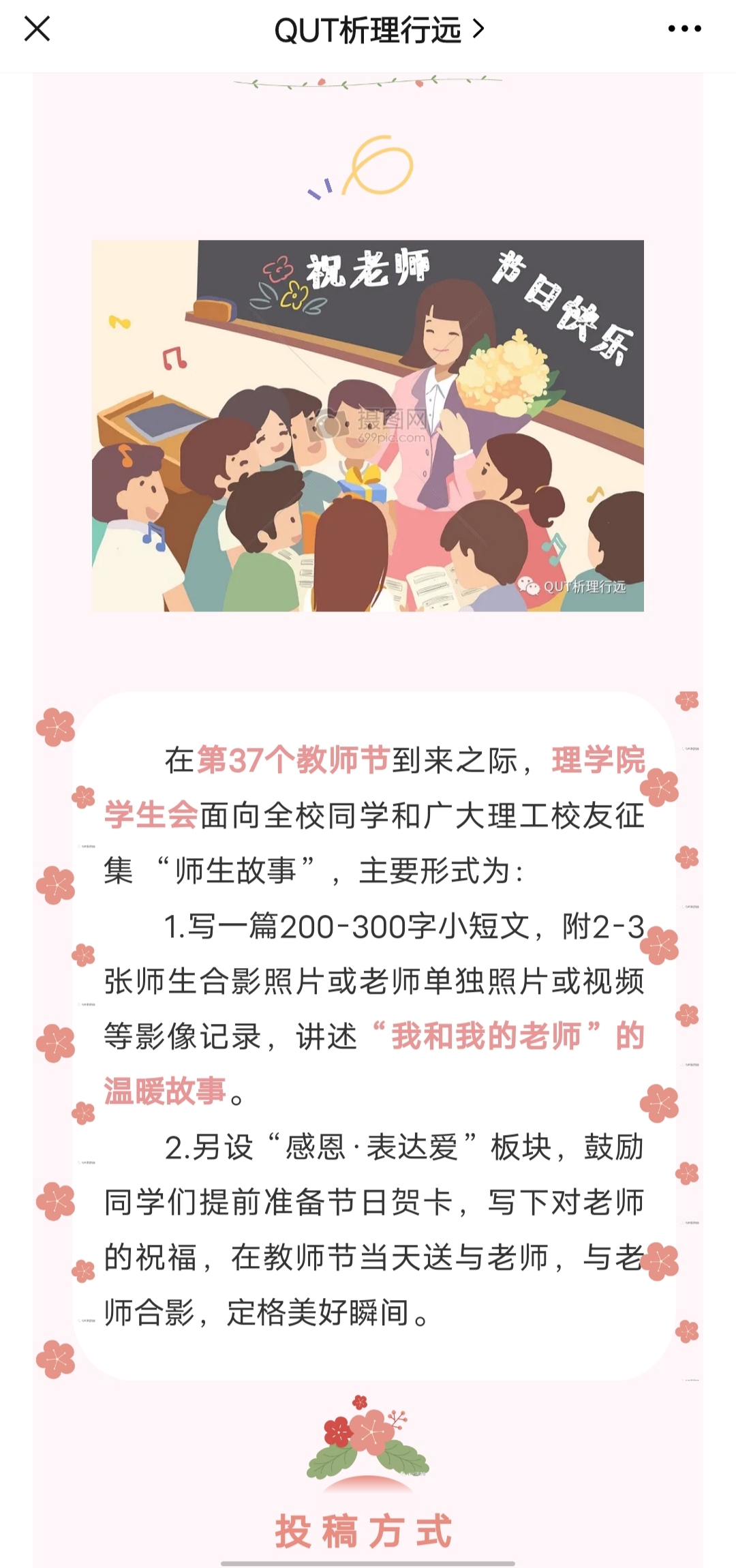 从9月5日开始,学院通过“析理行远”微信公众号启动“我和我的老师”故事征集活动,截止9月9日,共收到学生报名的故事、照片、祝福视频50余例。理研191刘雅新同学在她和她导师的故事中说道:“非常幸运能够成为岳军老师的关门弟子,无论上课还是做科研,老师严谨细致、自信坚定的态度永远影响我、激励我!今天是老师的节日,初心不改,感恩吾师,祝您节日快乐!”