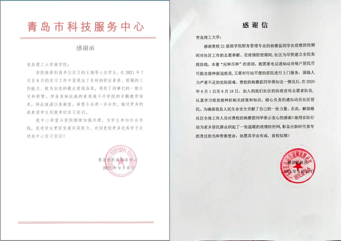 近日,两封分别来自青岛市科技服务中心和日照市五莲县洪凝街道解放路社区居民委员会的感谢信被送至商学院老师手中,信中分别对参加青岛市科技服务中心暑期实习实践的王瑀等7位商学院研究生和在社区进行疫情防控的财务管理211班杨雅茹同学表示感谢。