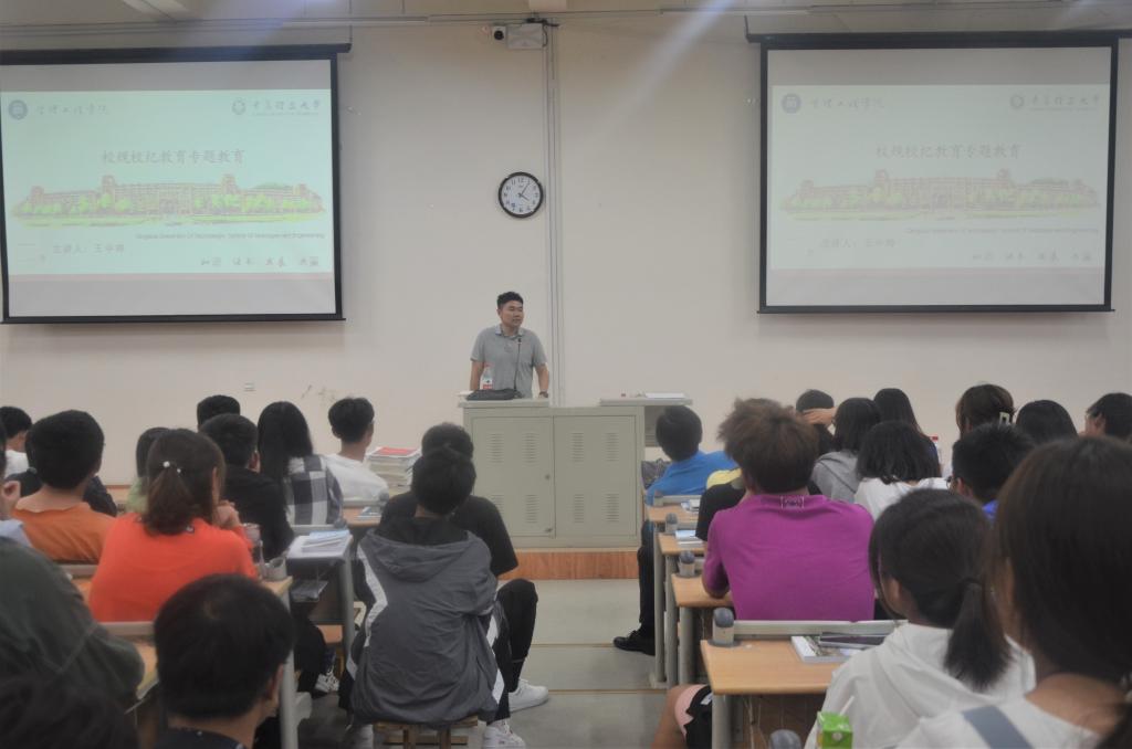 为加强2021级新生对学校学院相关规章制度的学习和认识,培养学生自觉遵守校纪校规的意识,规范文明行为。9月18日,管理工程学院于嘉陵江路校区主教学楼西报告厅举办2021级新生校规校纪主题教育,本次讲座由学院党委副书记王中帅主讲。