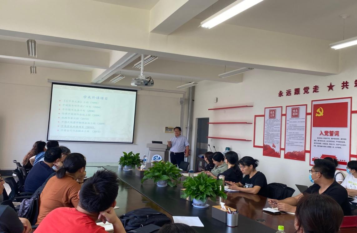 吕耀中首先介绍了我国现有的学术外译项目包括《大中华文库》工程、中国图书对外推广计划、中外图书互译计划等八类外译项目。继而,运用详实的数据、直观的图表分析了学术外译项目的立项趋势和规律,分别从项目宗旨、选题特点与变化、基本要求、资助要求等做了详细的讲解。针对申报过程中的政策变化、申报书撰写、团队合作等重要问题,吕教授借助已立项目的申报书和翻译样章进行了清楚详细的呈现,运用名家译句展示了“译无定法”、意义为重的高质量翻译原则。最后,吕耀中鼓励大家忠于兴趣、潜心研究,充分结合学院优势和自身特长,明确目标、坚定信心、坚持不懈,既推动学院科研工作向上向好发展,又为中国文化“走出去”贡献自己的一份力量,巩湘红教授对吕耀中教授的报告表示感谢并作总结发言。