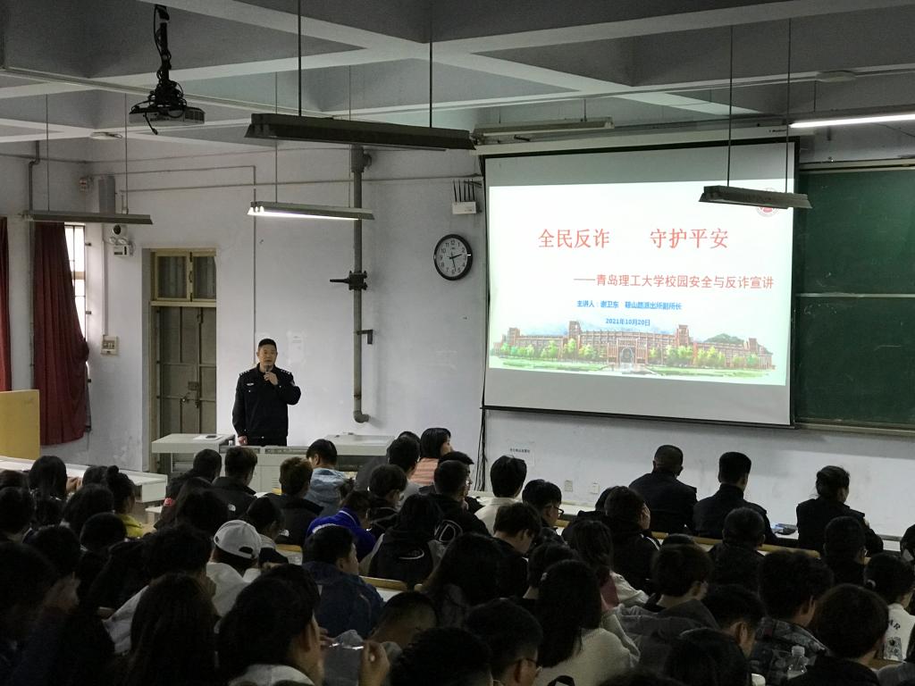 为普及网络安全知识,提高同学们的防诈骗意识,10月20日,安全管理处于一号教学楼200阶组织开展“全民反诈,守护平安”反诈宣讲,建筑与城乡规划学院承办本次活动。鞍山路派出所副所长谢卫东担任主讲,安全管理处副处长陈松,艺术与设计学院学生工作办公室主任、团委书记张恬,建筑与城乡规划学院辅导员张宇及市北校区各学院学生参加。