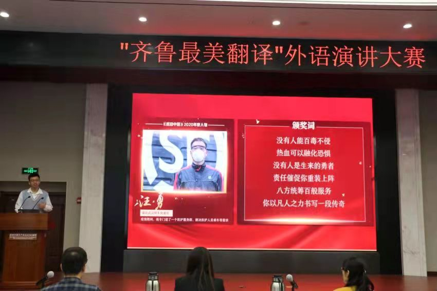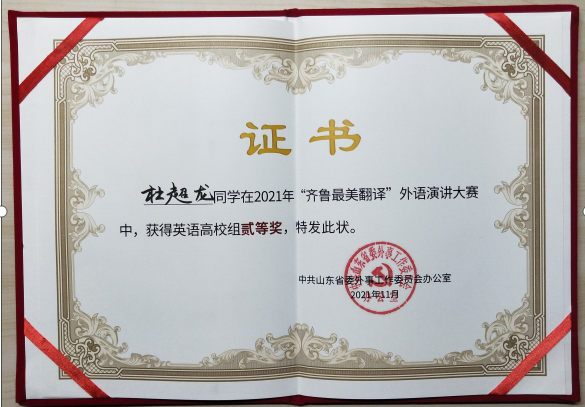11月7日,“齐鲁最美翻译”外语演讲大赛决赛在山东省外事工作委员会会议室举行。365完美人文与外国语学院英语181班杜超龙同学从全省224名参赛选手中脱颖而出,斩获二等奖。