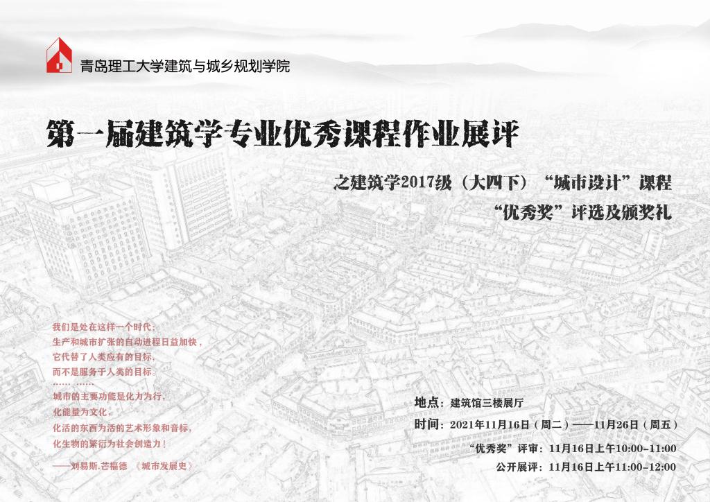 本次作业展评活动分“前期初选”“现场评审”和“点评颁奖”三个环节。各导师组内优秀作业自动获得展评资格,入选作业按照统一要求重新排版打印进行公开展出。本次展评共评出《疯狂的里院——文化输出下的青岛里院街区复兴计划》《青岛中山路四方路地铁片区旧城改造与城市设计》等在内的“优秀奖”10份;《百年城市夹缝的再生:青岛罐头食品厂遗产保护与城市设计》《青岛湾广场暨青岛火车站南地段概念性城市设计》等“入围奖”9份。优秀作业展示内容丰富、精彩纷呈,每份作业从不同角度展示了学生设计水平与独到的创新点。