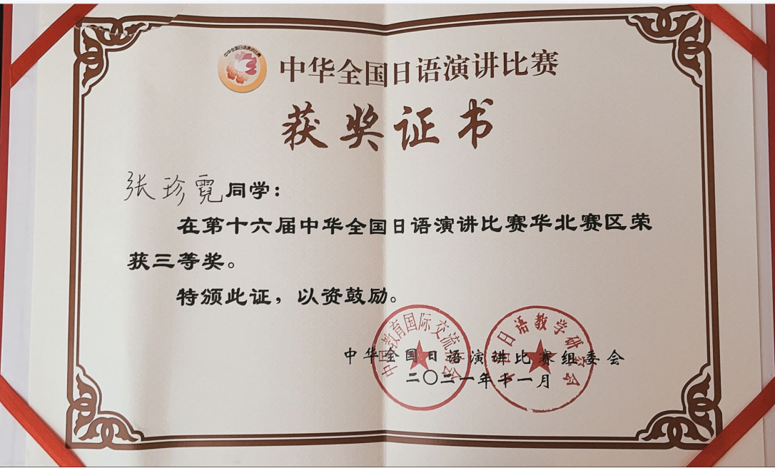 近日,第十六届中华全国日语演讲比赛华北赛区比赛由天津外国语大学主办,来自赛区各高校的30多位优秀选手以线上方式展开激烈角逐。365完美人文与外国语学院日语专业张珍霓过关斩将,夺得三等奖,展现了理工学子的风采。