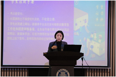 会上,刘奕交流介绍了团委社团部工作概况,以学年时间节点的方式向各社团负责人详细介绍了学生社团年度重点工作,并提出各社团要围绕“小社团、大思政”的工作理念,致力于打造有思想、有特色、有影响的社团精品活动。