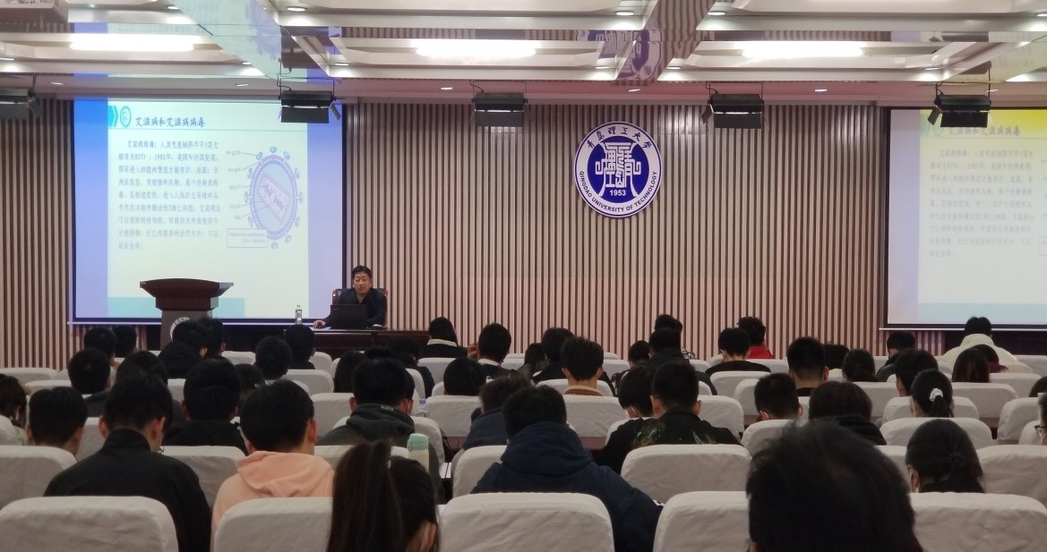 在报告厅,西海岸中心医院感染科主任王传林受邀为辅导员和学生代表进行艾滋病防治知识讲座。王传林主任从艾滋病病因讲起,通过生动鲜活的案例,系统介绍了艾滋病的常见表现、传播途径和防治办法,使大家充分认识到在不正规医疗场所打针输液、在消毒不规范场所打耳洞纹身,与他人共用剃须刀牙刷的危害性,引导大家养成良好健康的生活习。