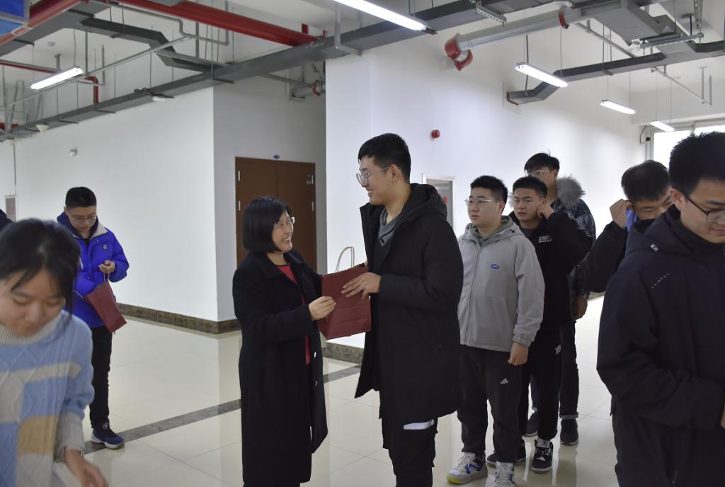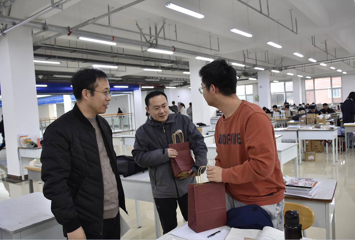 在慰问活动前,学院组织班主任、辅导员老师按照学生报考志愿为400多名考研学子在精心选取的对应中国名校明信片上逐一手写下了同学姓名和祝福语,并为每名同学挑选了具有马到“橙“功、“苹”安顺利美好寓意的橙子和苹果,将以上祝愿放入吉祥如意的红色纸袋中组成一个个凝结学院爱心的幸运福袋。活动现场,毕学军鼓励同学们:“考研是一个征程,也许平坦,也许艰辛,是对人的意志力、执行力的考验,希望同学们勇往直前,戒骄戒躁,金榜题名。”建环183王昊同学说:“感谢学院老师的关心,真是给了我们一个大大的惊喜,我们一定会努力学习,不辜负期望,考取研究生,争取更大的发展,将来回馈学校、学院。”