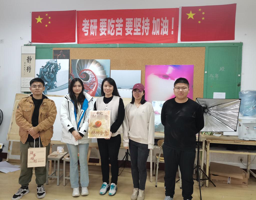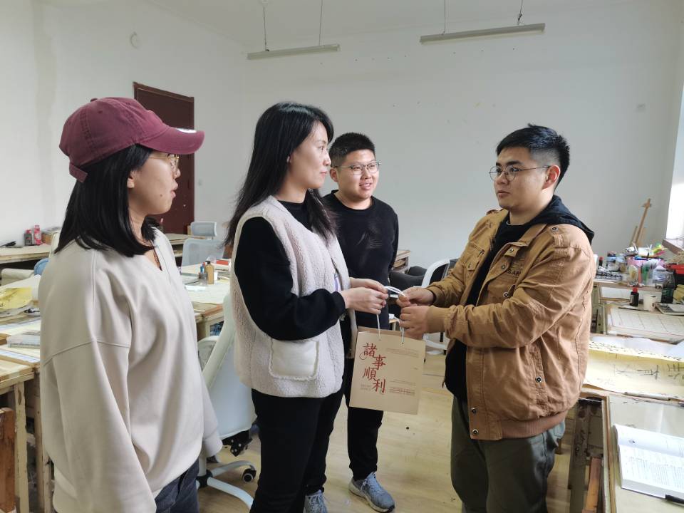秋送凉风金万谷,冬飞寒雪题名时。2022年全国硕士研究生考试已经进入倒计时,考研学子们正朝着他们的梦想做着最后的冲刺。为缓解备考压力,增强考研信心,12月21日,下午艺术与设计学院学院学工办主任、分团委书记张恬,就业辅导员舒文、2018级辅导员李钦和环设183班班委,走进自习室、图书馆以及学生宿舍,积极开展考研助力送温暖活动,为考研同学送去冬日的温暖祝福。