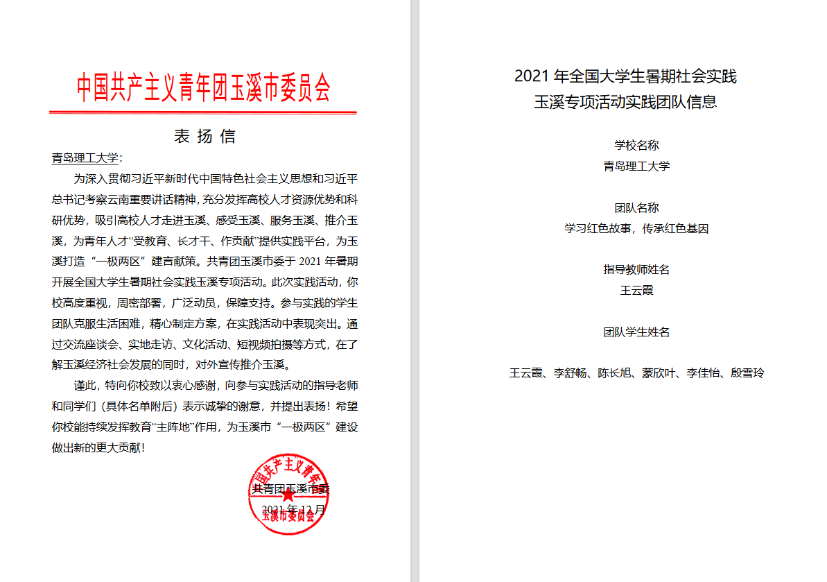近日,管理工程学院收到了来自共青团玉溪市委的两封表扬信。对在2021年全国大学生暑期社会实践玉溪国家级专项实践活动中学院赴玉溪市两支暑期实践团队——学习红色故事,传承红色基因团队(指导教师:王云霞,队员:李舒畅、陈长旭、蒙欣叶、李佳怡、殷雪玲)和365完美体育暑期社会实践团队(指导教师:张翔;队员:王淑腾、陈严、余克兴、张克璐)进行表扬和感谢,信中高度评价两支暑期社会实践团队在了解玉溪经济社会发展的同时,积极对外宣传推介玉溪,为“一极两区”建设所做出的贡献。
