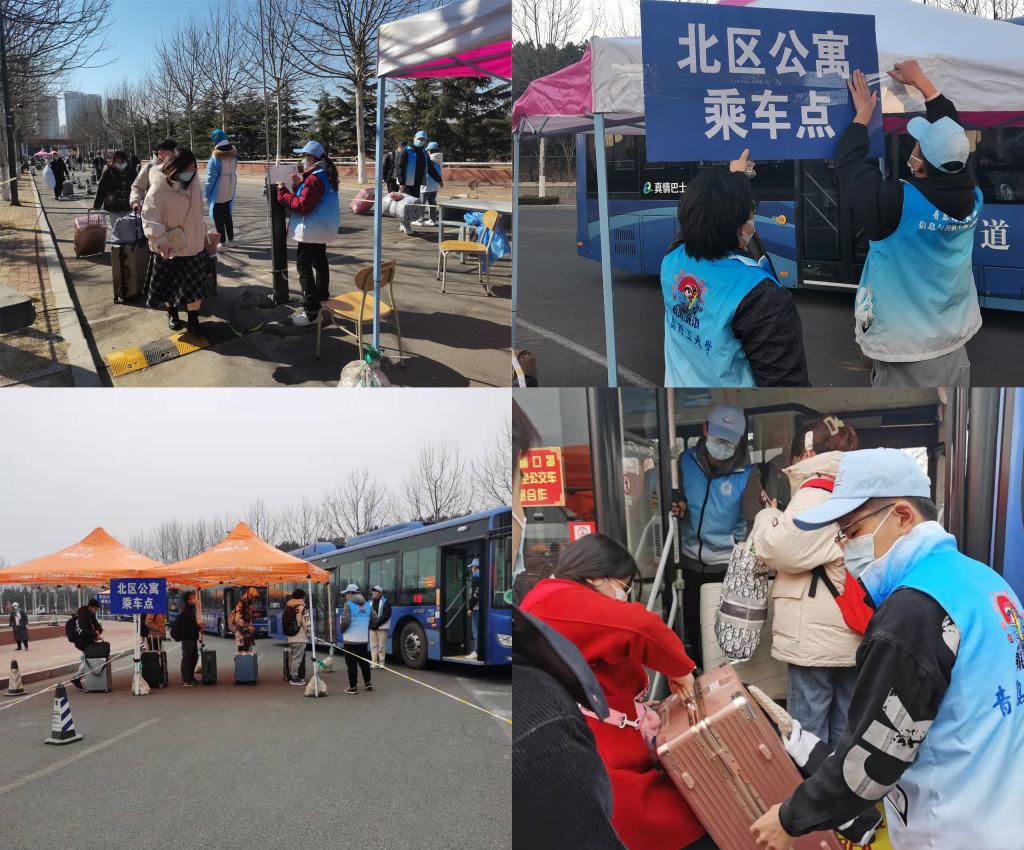 与王鹏程一样的第一批“青小鲤”返校志愿者一共有310名同学,他们在收到征招志愿者的通知后第一时间报名并提前一天回到学校,早早做好志愿服务的准备。2022年春季开学,市北、西海岸新区两校区将在两天内返校2万5千余人,每一名同学都要按照学校疫情防控规定经过测温、消毒、核验身份等流程后方可入校,这样的工作量可想而知。非常时期,不光学校学工干部全体上线,更少不了“青小鲤”的鼎力相助,师生携手共同守护学校防疫堡垒。“青小鲤”引导返校同学办理进校手续、维持校门人流秩序、指引同学们有序乘车、帮助学生搬运行李,用实际行动奏响了一曲生动的志愿之歌,凸显了理工力量。