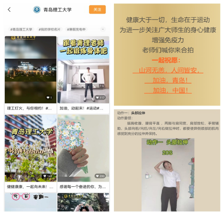 体育教学部举办、大学生体育联盟发起“每天锻炼一小时!同心抗疫克时艰!”系列体育活动,体育教师在线指导,发挥体育社团的组织力和引导力,引领带动同学们积极参加体育锻炼。体育教学部青年教师拍摄居家健身视频,通过365完美体育微信公众号、视频号、抖音等新媒体平台,线上喊话同学们跟着视频锻炼,争当“健身达人”。