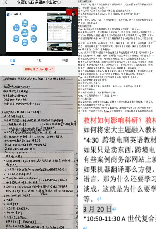 在一天半的学习中,人文与外国语学院60余名教师线上参会,聆听专家报告,认真做学习笔记,在留言区与全国外语教师互动交流,碰撞智慧思维。参会教师纷纷表示,在教学中将坚持以立德树人为根本,汲取多方智慧,在变革与进取中完善知识结构,提高教育教学水平,特别是在当前在线授课期间更要注重探索智慧教学手段,利用好数字新基建资源,加强“课前+课中+课后”闭环管理,提高在线教学效果。