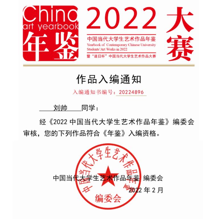 本次大赛由创意中国设计联盟、北京设计学会等18家单位主办,面向全国高等院校在校学生征集作品。大赛分绘画基础、设计基础、造型艺术、书画艺术、手工艺术、摄影艺术、视觉传达设计、建筑环艺设计、工业设计、染织服装及形象设计、影视动漫及新媒体实验艺术等11个征稿类别。在临沂校区教师郑小强、王轲、李云的指导下,刘帅同学的作品《清廉》获得视觉传达设计类作品竞赛三等奖,并被《2022年中国当代大学生艺术作品年鉴》收录。