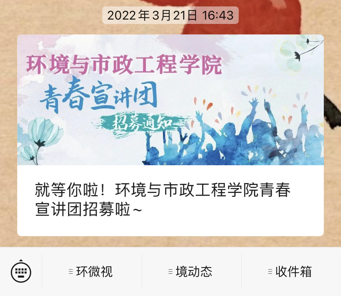 众里寻他——招募选拔优秀er。环境与市政工程学院青春宣讲团共设思想引领,学风领航,科技创新、志愿服务、社会实践、文体活动六个分团,招募政治立场坚定、学习成绩优异、科研能力突出、志愿服务经验丰富、积极参加社会实践及文体活动、刻苦努力,执着坚毅,追求卓越,全面发展的优秀环境学子,以优秀学子的典范力量激励一届又一届环境学子奋发图强。16名品学兼优的本、研学生加入到环境与市政工程学院青春宣讲团。