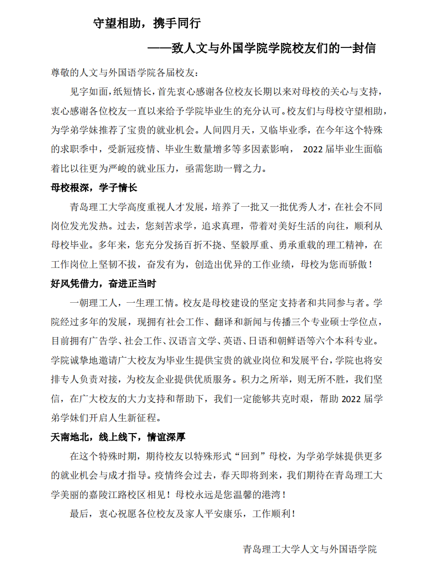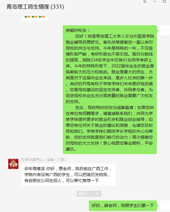 校友反哺来送岗,人文关怀办实事。充分发挥广大校友的作用,在校友群众发布《致人文与外国学院校友的一封信》,校友们收到信后反映热烈,目前已经有广西、青岛等地校友推荐工作岗位,有四家校友企业发来招聘信息。