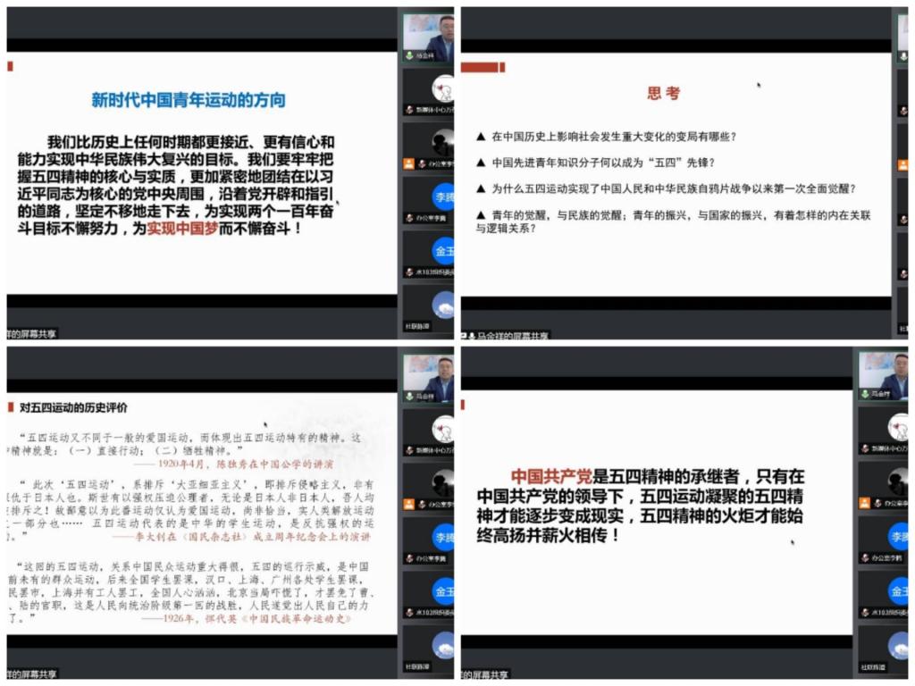 为纪念五四运动103周年,做好青年学生思想引领工作,环境与市政工程学院邀请共青团中央中国青少年研究中心、中国青少年研究会青运史分会特约研究员马金祥博士做客学院青马课堂,作主题为“百年五四与青年担当”的云端讲座,学院200余名青年学生线上参加,讲座由学院团委书记花会娟主持。