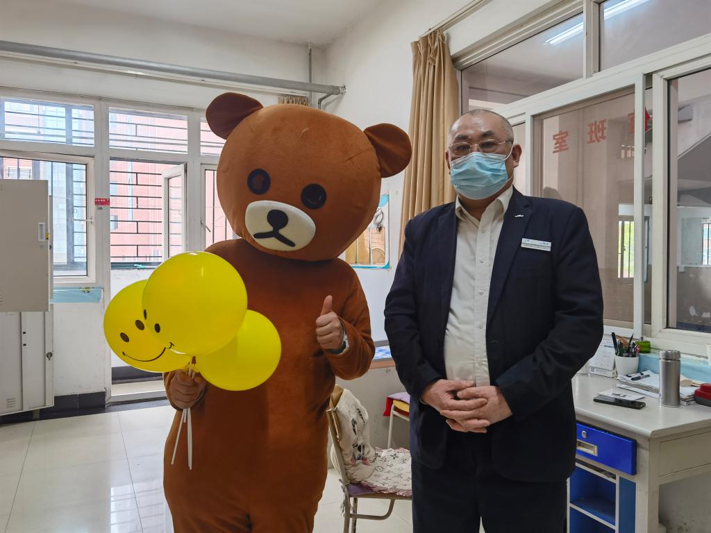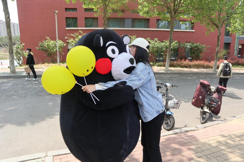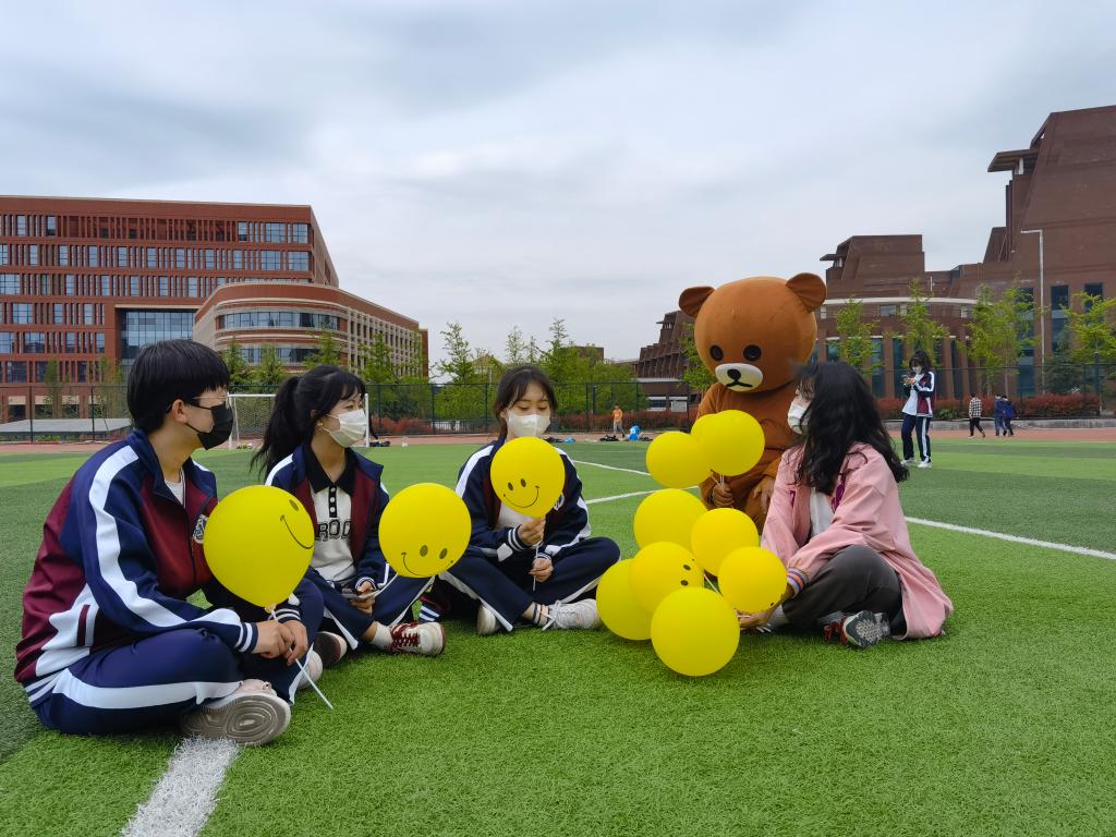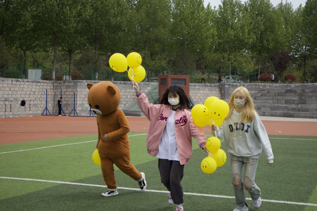 校园采访捕捉心晴瞬间。“你知道今天是世界微笑日吗?” “今天你微笑了吗?”一场热闹的随机采访正在教学楼、宿舍、操场上演,小记者用幽默的语言引导同学们分享自己的快乐,阳光下,口罩也难掩同学们眉眼盈盈的笑意,当然也偶有心情不佳的同学,心韵社可爱的“大熊”送上温暖的抱抱,瞬间化解心中失落的情绪。